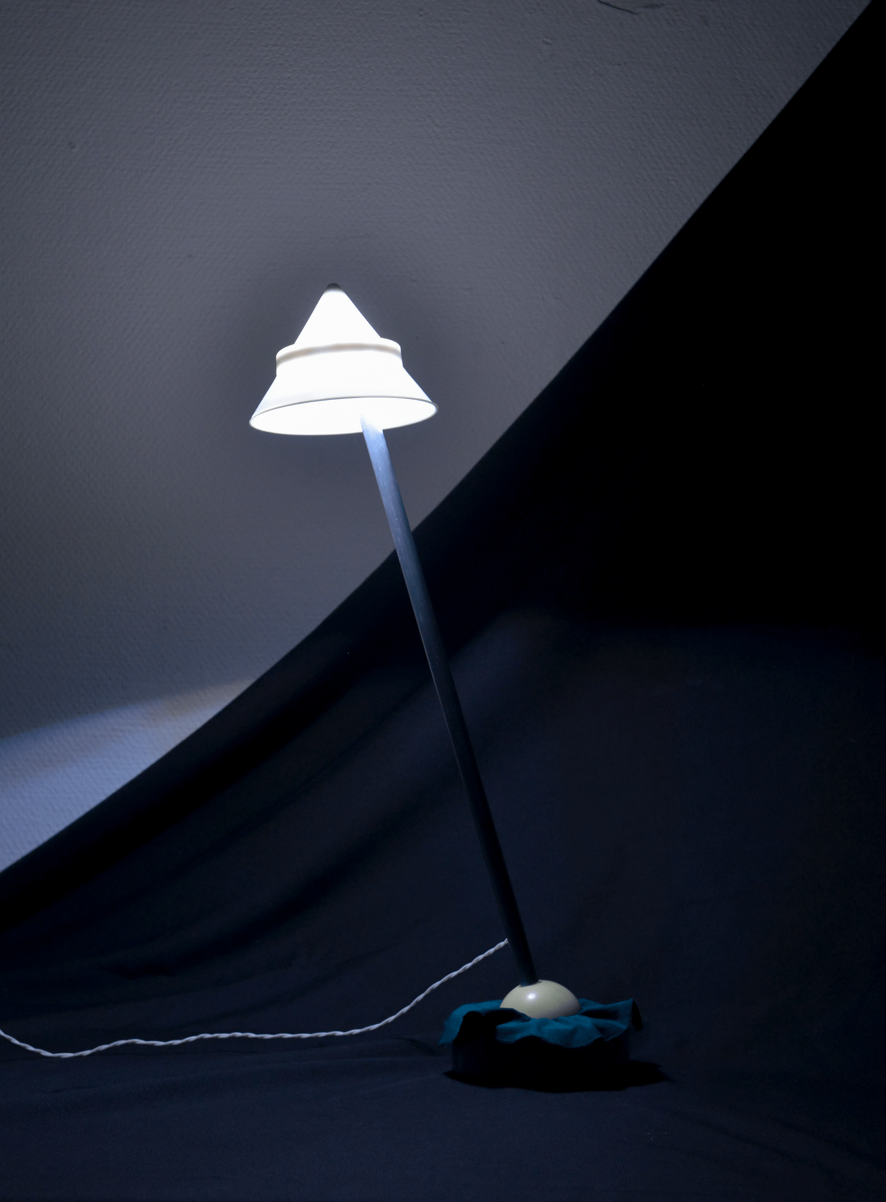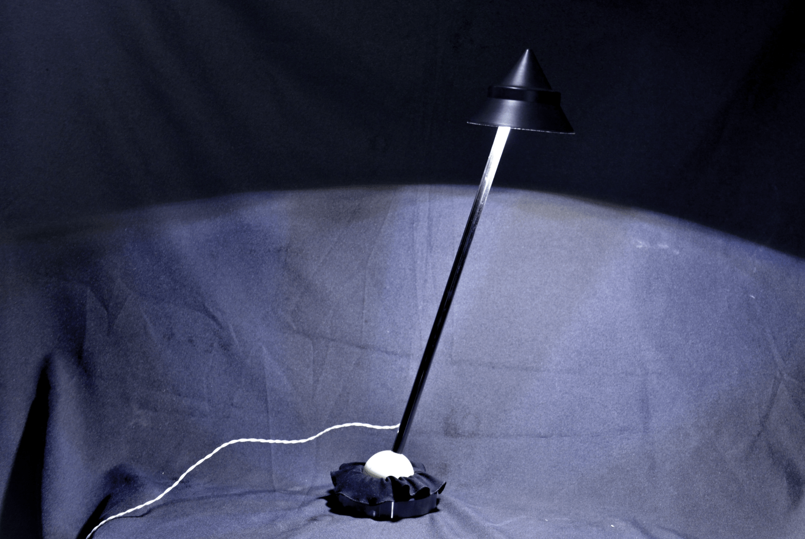 Friction light Black and white friction light. These lamps are inspired by a knee joint. The fabric serves as the muscles that hold the bullet in place. Materials: stainless steel, aluminum, fabric, plastic and leds.